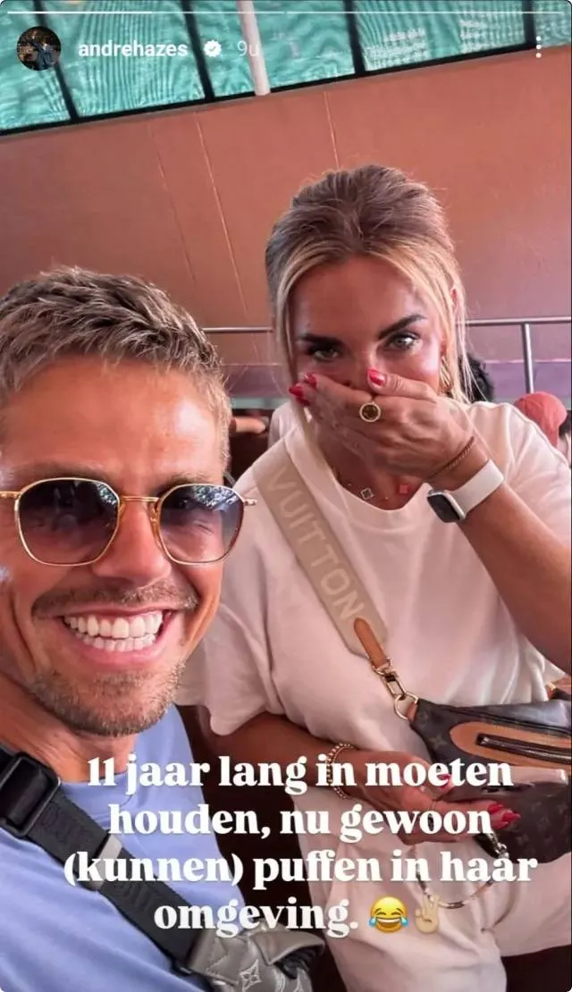 We zien Monique met een hand voor haar neus en een lachende André. Bij de foto schrijft hij de tekst: ''11 jaar lang in moeten houden, nu gewoon kunnen puffen in haar omgeving.''