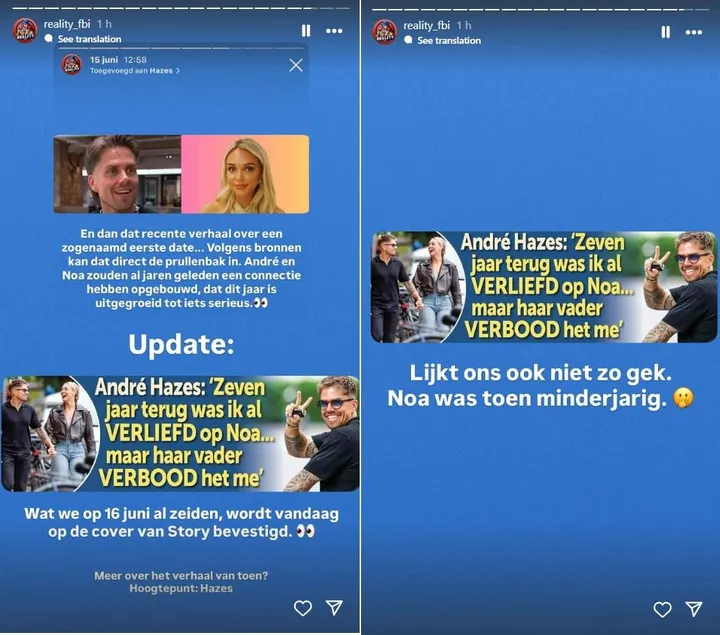 Maar nu bevestigt André het gewoon zelf tegen weekblad Story. Hij laat weten dat hij zeven jaar geleden, toen Noa nog minderjarig was, al straalverliefd op haar was. Dat het toen iets had kunnen worden, werd verboden door Noa's vader...