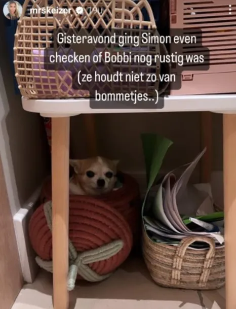 Via haar sociale media-kanaal deelt ze zielige foto's van de kleine Bob. Voor wie het niet weet: Bob is een hond. Ze schrijft: ''Gisteravond ging Simon even checken of Bobbi nog rustig was (ze houdt niet zo van bommetjes). Ze voelde zich niet erg op haar gemak.''