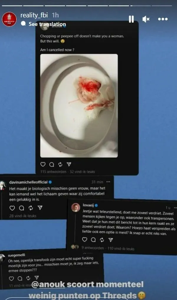 Vermoedelijk wist ze zelf al dat dit niet zo lekker zou vallen bij trans-omarmend Nederland. De zangers vraagt namelijk of ze nu gecanceld gaat worden. In de tussentijd reageren er veel BN'ers op de post. Ze zijn volledig in shock door wat Anouk zegt. Onder meer Claudia de Breij en natuurlijk Tim Hofman zijn helemaal van het padje en kunnen de tranen nauwelijks bedwingen.