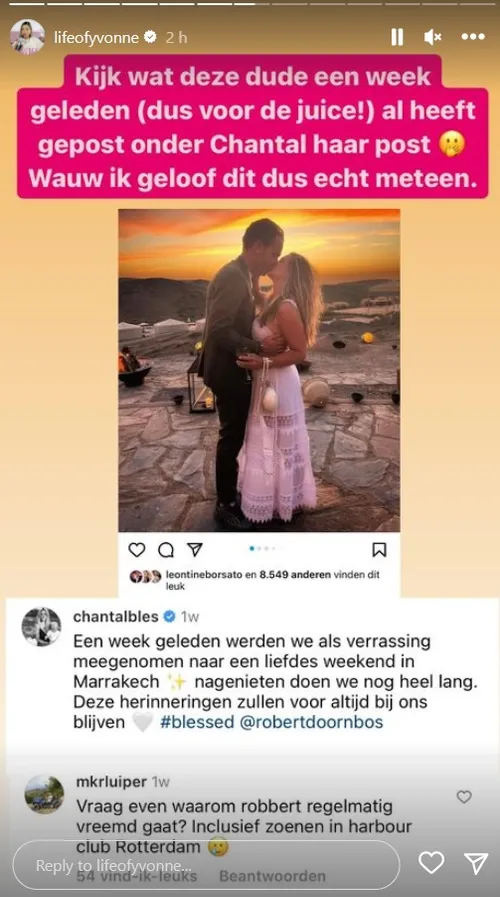 Volgens Yvonne krijgt wordt ze al tijdens overspoeld met berichten over Robert en Chantal. ''Dat gaat niet alleen over de asociale manier waarop ze omgaan met mensen die dichtbij hen staan, maar met name het cheatgedrag van dhr. Doornbos steekt er met kop en schouders bovenuit.''