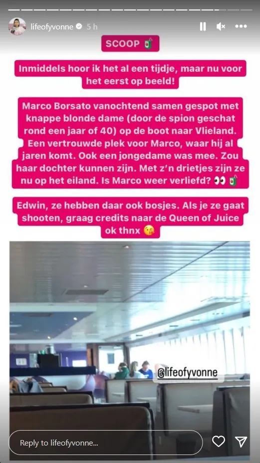 Wat we zien is een blonde vrouw die (met haar dochter) tegenover Marco Borsato zit. Yvonne noemt het een 'scoop' oftewel een primeur. Het gezelschap zou samen naar Vlieland zijn gegaan, waar Marco reeds jarenlang vaste gast is. Ze roept Story-fotograaf Edwin Smulders op om snel wat foto's te komen maken.