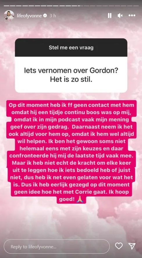 Yvonne wil niet voortdurend door Gordon 'op het matje' worden geroepen en is er helemaal klaar mee. ''Ik heb niet echt de kracht om elke keer uit te leggen hoe ik iets bedoeld heb of juist niet. Dus ik heb het even gelaten voor wat het is.''