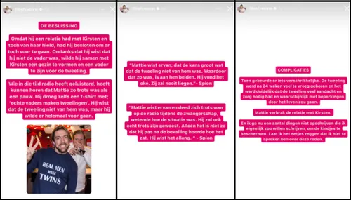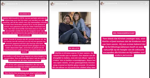 Mattie en Kirsten waren 12 jaar samen. De relatie kende ups en downs. Een manier om dit draaglijk te maken was om van elkaar goed te vinden dat ze beiden vreemdgingen. Noem het een open relatie, of een gedoogbeleid. Ze wisten het van elkaar, en vonden dat allebei prima. Toen bleek dat Kirsten zwanger was, wist Mattie vrijwel direct dat de kinderen niet van hem waren.''