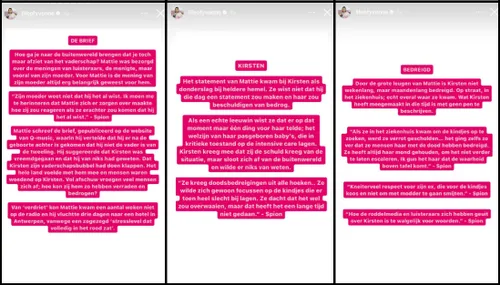''Door toedoen van Mattie is Kirsten ernstig bedreigd. Op straat, in het ziekenhuis; overal kreeg ze de meest erge dingen naar haar hoofd. Ze heeft altijd haar mond gehouden. Maar nu gun ik het haar dat deze waarheid naar buiten komt. Ik heb veel respect voor Kirsten, die koos voor de kinderen te zorgen in plaats van moddenvechten met Mattie.''
