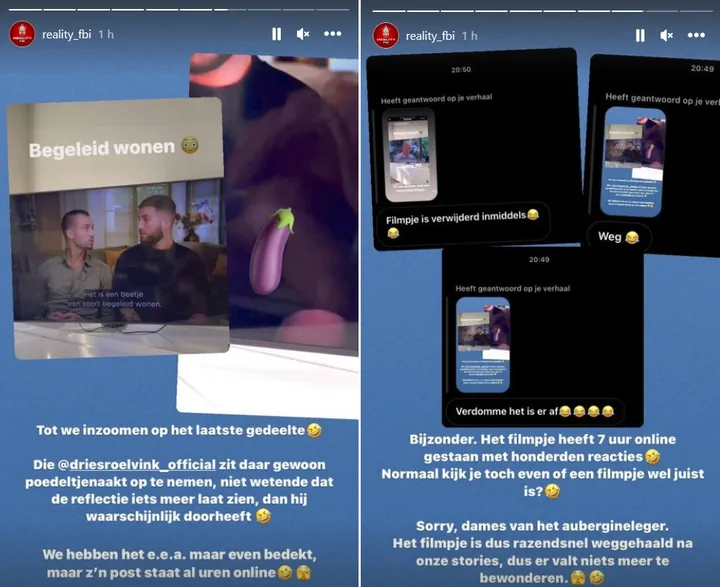 Dat had hij zelf blijkbaar niet door, want de beelden hebben langer dan zeven uur online gestaan. Er kwamen honderden reacties. Pas nadat Dries Roelvink door oplettende kijkers werd geattendeerd op de zaak, schrok Dries zich 'kapot'. Tegen