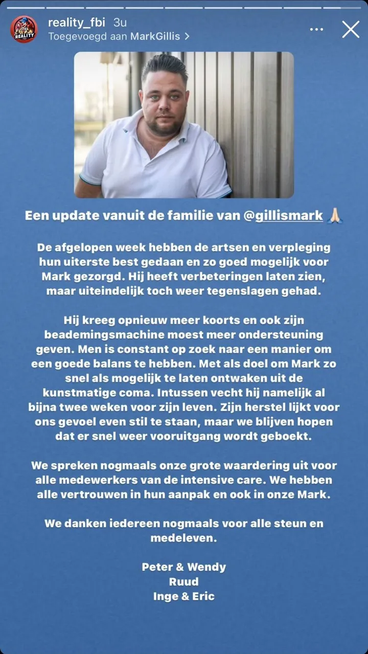 Zojuist is er weer een update vanuit de familie Gillis gegeven. ''De afgelopen week hebben artsen en verpleging hun uiterste best gedaan en zo goed mogelijk voor Mark gezorgd.''