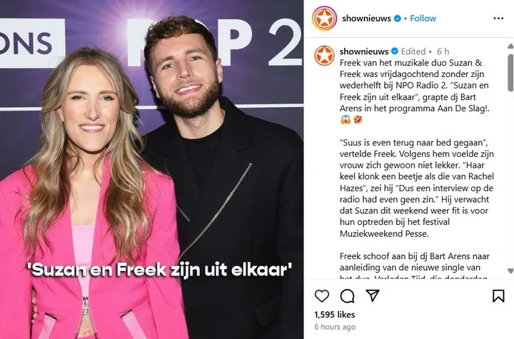 Shownieuws heeft fans van het zangduo Suzan en Freek de stuipen op het lijf gejaagd. Vanmiddag stond er groot op de website dat de twee 'uit elkaar' zijn. Maar wie het bericht aanklikte, las wat er werkelijk aan de hand was.