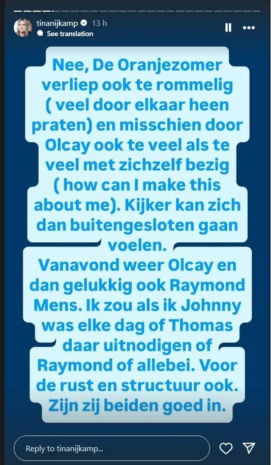 Tina Nijkamp heeft zich ook ontzettend gestoord aan de uitzending van De Oranjezomer van gisteren. Volgens de tv-expert praten de gasten alleen maar door elkaar heen en dat ligt vooral aan Olcay. ''Die is te veel met zichzelf bezig.''