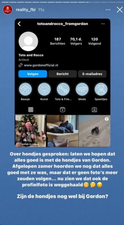 Er is flinke ophef ontstaan over Gordon. De zanger zelf is al maanden afwezig, maar mensen vragen zich af hoe het met zijn hondjes gaat. Waar zijn Toto en Rocco?