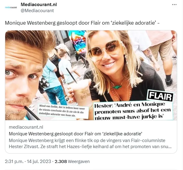 Monique Westenberg krijgt momenteel bakken met hevige kritiek over zich heen. Het knipperlicht-vriendinnetje van André Hazes filmde haar hem terwijl hij een bakje snus uit zijn zak haalde en dit vervolgens sneaky onder zijn bovenlip propte. Mo postte het filmpje daarna vol trots op Instagram. Flair