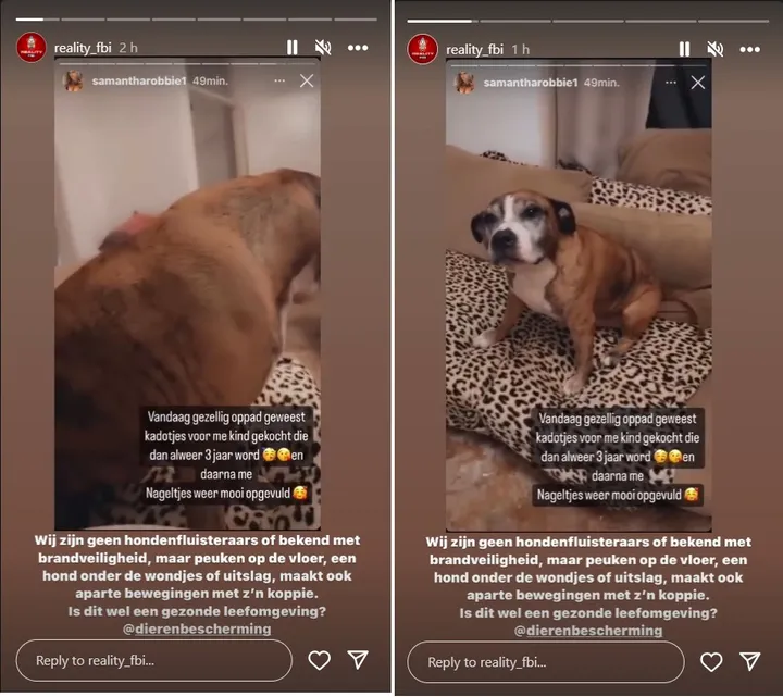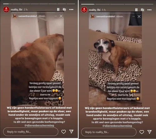 De woning ligt bezaaid met sigarettenpeuken, terwijl de hond volzit met wondjes of uitslag. Ook maakt de hond 'aparte bewegingen' met zijn koppie. Het kanaal is hier zo van onder de indruk, dat de dierenbescherming is getagged.