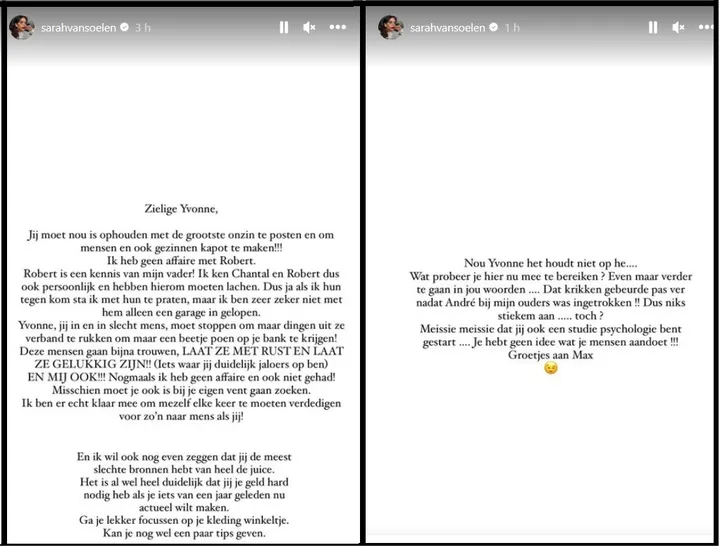 Dat bericht is inmiddels aangekomen bij Sarah van Soelen en die is pisnijdig. Op haar Instagram gaat ze helemaal los tegen Yvonne. ''Jij moet nou eens ophouden met de grootste onzin te posten en om mensen en gezinnen dus kapot te maken.'' Robert is een kennis van mijn vader.''