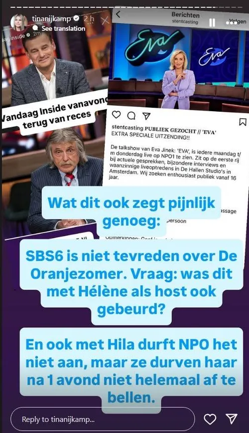Tina denkt zelf van niet. ''Ter info: twee jaar geleden werd De Oranjezomer niet vervangen door VI op de dag dat het kabinet viel. Toen had Hélène onder anderen Özcan Akyol en Jan Slagter aan tafel.''
