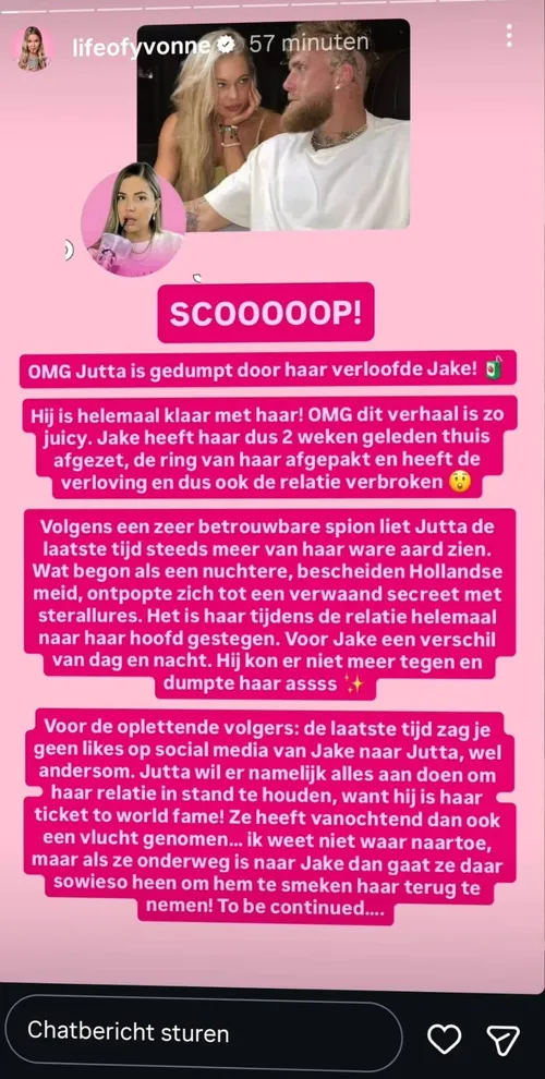 Juicekoningin Yvonne Coldeweijer komt op het einde van deze zonnige Tweede Paasdag met heftig nieuws op Instagram. Volgens Yvonne is er een einde gekomen aan de relatie tussen Jake Paul en Jutta Leerdam.