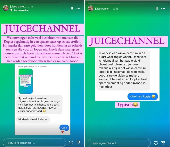 Bij Juicechannel, een kanaal op Instagram, komen er echter zorgwekkende verhalen binnen over Rogier. Een 'spion' die in het winkelcentrum werkt waar Rogier in de buurt woont, laat het volgende weten.