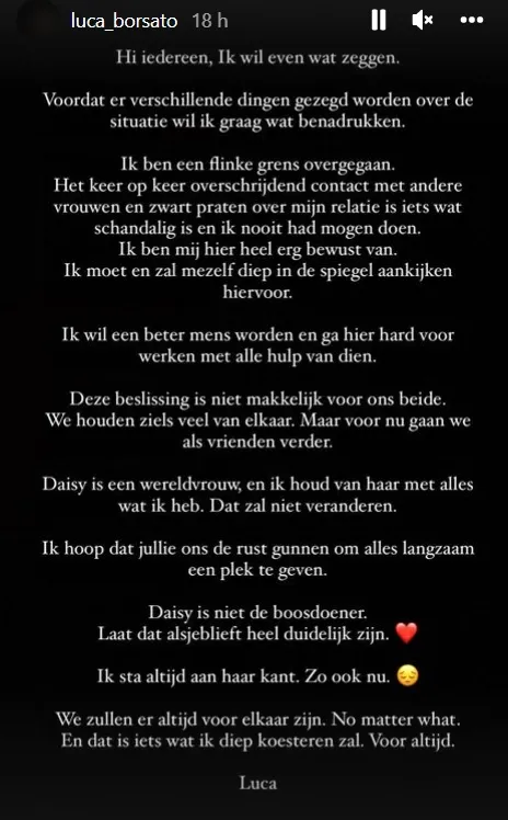 Luca Borsato heeft het volledig verbruid. Niet alleen bij zijn ex-vriendin Daisy, maar ook bij zijn volgers op sociale media. Na een tijdje stil te zijn geweest over alle commotie, vindt Luca het nu tijd om te reageren op de ophef. Op Instagram heeft hij een emotionele verklaring gepost.