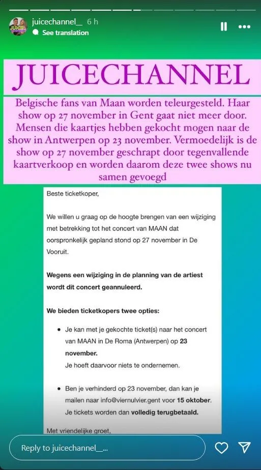 Kopers krijgen twee opties: geld terug of uitwijken naar een concert in Antwerpen dat vooralsnog wel doorgaat. Niet best allemaal...