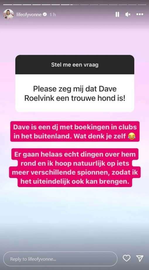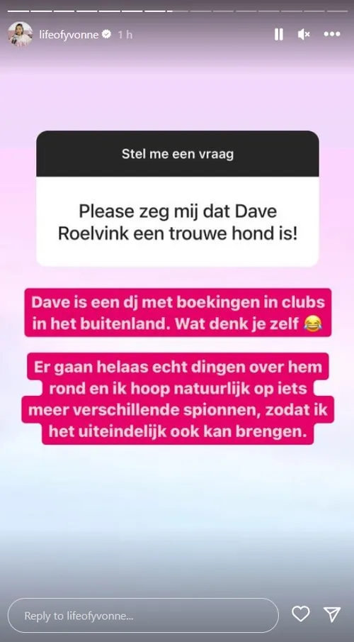 Dat meldt de juicekoningin op Instagram. Een volger stelt haar een vraag of Dave Roelvink 'een trouwe hond' is. Daarop schrijft Yvonne: ''Dave is een dj met boekingen in het buitenland. Wat denk je zelf? 😂''