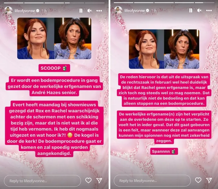 Dat meldt Yvonne Coldeweijer zojuist op Instagram. ''Evert Santegoeds heeft maandag bij Shownieuws gezegd dat Roxeanne en Rachel waarschijnlijk achter de schermen bezig zijn met een schikking. Maar dat is niet wat ik al die tijd heb vernomen'', aldus Yvonne.