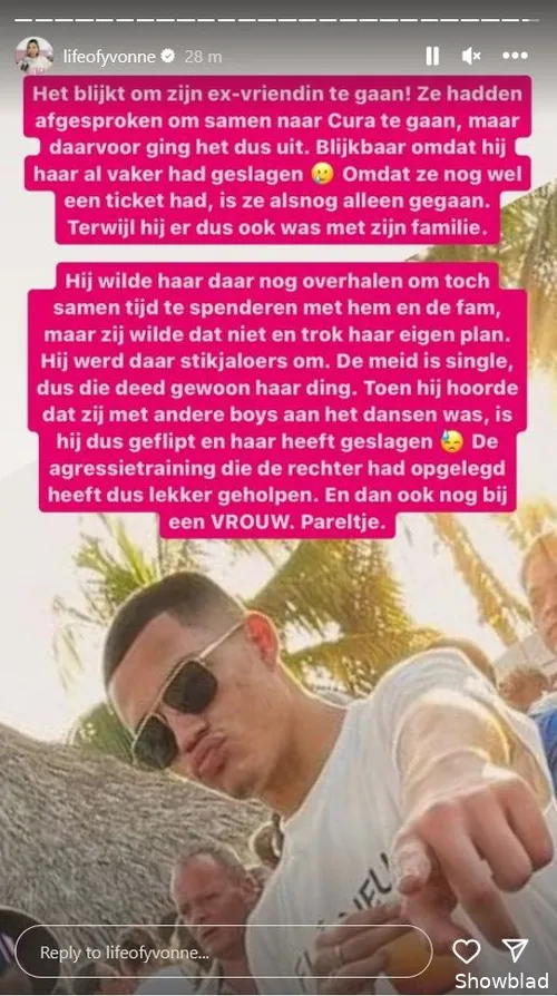 Tot dusver meldde Yvonne dat hij een meisje had geslagen, maar waren er nog geen nieuwe details bekend. Die zijn er nu wel. Op Instagram schrijft de juicekoningin dat het zou gaan om zijn ex-vriendin. De twee spraken met elkaar af om samen naar Curaçao te gaan.