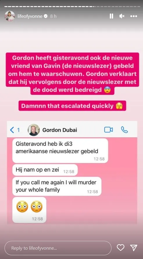 Het loopt helemaal uit de hand tussen enerzijds Gavin en zijn nieuwe vriend, en anderzijds Gordon. In een bericht aan Yvonne Coldeweijer laat Gordon weten dat hij Michael Andre Moreau heeft gebeld. Hij wilde de miljonair waarschuwen voor Gavin, maar werd met de dood bedreigd. Gavin postte gisteren een foto op zijn Instagram, waarin hij te zien is met zijn nieuwe liefde. Moreau is een zeer succesvolle nieuwslezer. Met zijn 65 jaar is hij tien jaar ouder dan Gordon, maar ook een stuk rijker. Gedurende zijn loopbaan heeft hij flink wat miljoenen geharkt.