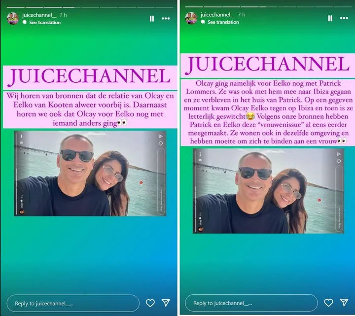 Juicechannel schrijft het volgende op Instagram: ''Olcay ging namelijk voor Eelko nog met Patrick Lommers. Ze was ook met hem mee gegaan naar Ibiza en ze verbleven in het huis van Patrick. Op een gegeven moment kwam Olcay Eelko tegen op Ibiza en is letterlijk geswitcht.''