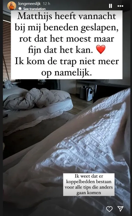 Afgelopen nacht heeft Matthijs bij haar geslapen op de benedenverdieping. ''Rot dat het moest, maar fijn dat het kan. Ik kom de trap niet meer op namelijk.''