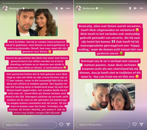 Nick Schilder. Volgens Yvonne heeft hij in 'elk dorp een affaire' gehad, terwijl hij al 17 jaar samen is met Kirsten. ''Van Spanje tot aan elk f*cking dorp waar hij ooit met Simon heeft opgetreden.''