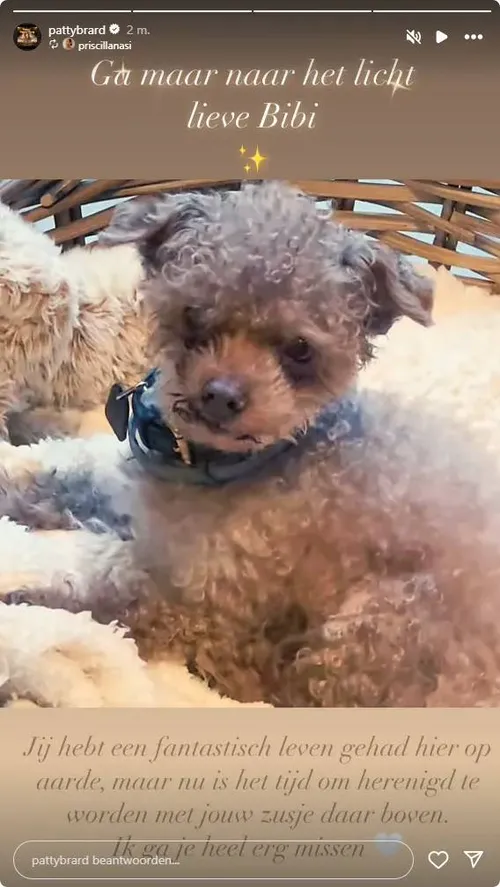 ''Jij hebt een fantastisch leven gehad hier op aarde, maar nu is het tijd om herenigd te worden met jouw zusje daarboven'', deelt Patty via haar Instagram-story. Ze laat weten dat ze haar hondje heel erg gaat missen.