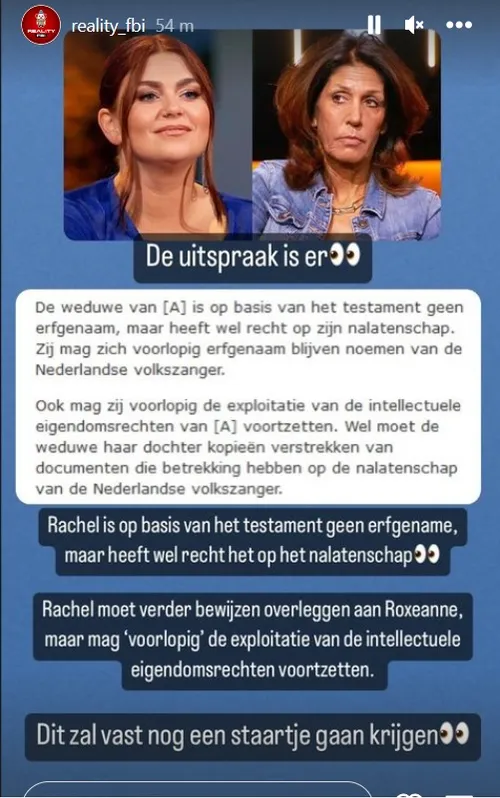 Maar of Rachel zich ook daadwerkelijk erfgenaam mag noemen hangt volgens de rechter af van de context. En dat kan niet worden beoordeeld in een kort geding. Roxeanne zal hiervoor een bodemprocedure moeten starten.