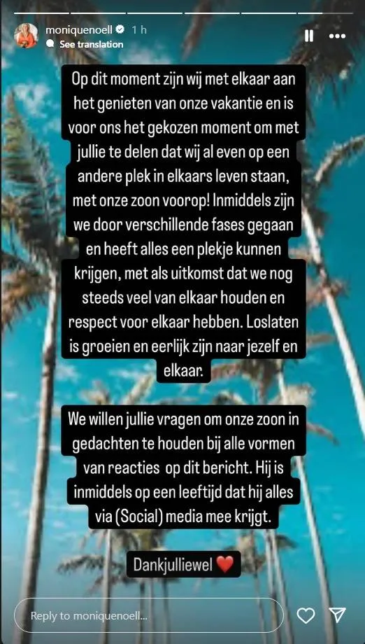 ''Op dit moment zijn wij met elkaar aan het genieten van onze vakantie en is voor ons het gekozen moment om met jullie te delen dat wij op een andere plek in elkaars leven staan, met onze zoon voorop!''