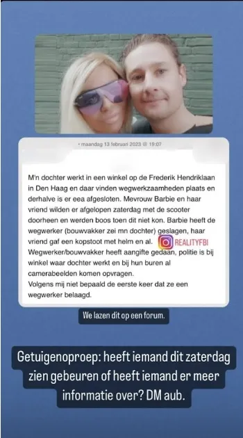 "Barbie heeft de werkgever (bouwvakker zei m’n dochter) geslagen. Haar vriend gaf een kopstoot met helm en al. Werkgever/bouwvakker heeft aangifte gedaan. Politie is bij winkel waar mijn dochter werkt en bij hun buren al camerabeelden komen opvragen. Volgens mij niet bepaald de eerste keer dat ze een werkgever [verkeersregelaar] belaagd."