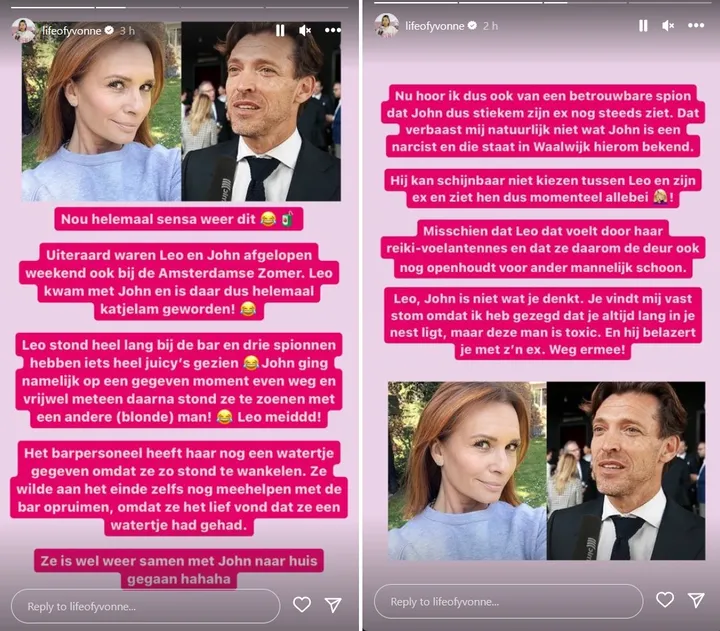 Yvonne Coldeweijer sluit haar Instagrampost af met een regelrechte waarschuwing aan het adres van Leontine: ''Hij is niet wat je denkt. Je vindt mij vast stom omdat ik heb gezegd dat je altijd lang in je nest ligt, maar deze man is toxic. En hij belazert je met z'n ex. Weg ermee!''