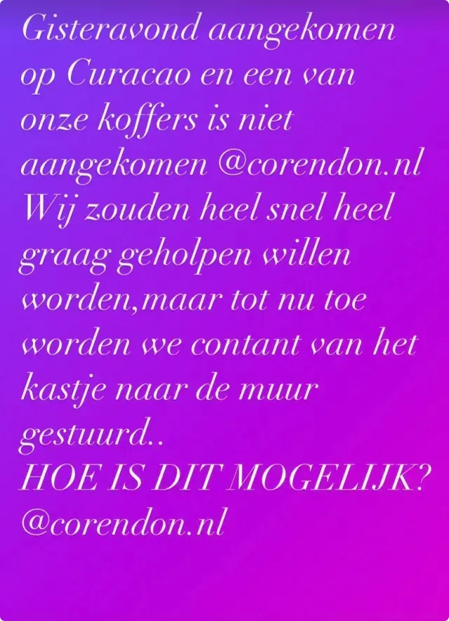 "Gisteravond aangekomen op Curaçao en een van onze koffers is niet aangekomen", schrijft Glennis in haar story op Instagram.