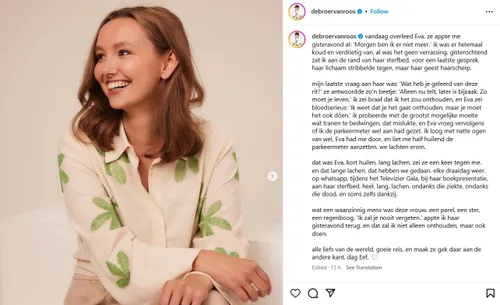 Op het Instagramkanaal Longeneeslijk van Eva verscheen gisteravond het bericht dat Eva was overleden. In het bericht stond ook
