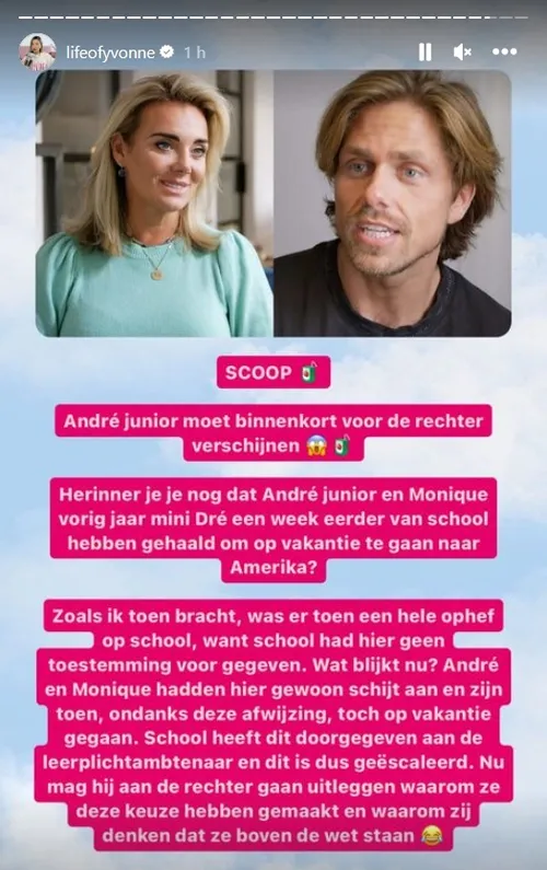 Die wilden hun kinderen namelijk ook graag meenemen op vakantie, buiten de daarvoor aangewezen periodes om. Yvonne Coldeweijer meldt nu dat het de school het verzoek afwees, maar dat André Hazes en Monique dus alsnog op vakantie zijn gegaan met hun kind. De school heeft dit doorgegeven aan de leerplichtambtenaar. ''Het is nu volledig geëscaleerd.
