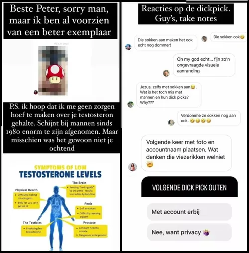 Tot slot wil Victoria van haar volgers weten wat ze moet doen met de volgende d*ckpic die binnenkomt. Moet Koblenko dan alles openbaar maken? Foto en de accountnaam? Of is de privacy van diegene belangrijker dan zo'n foto? Als je het aan ons vraagt kiezen we optie A. Wat vind jij?