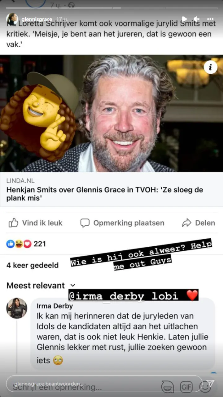 Ook Grace haar volgers nemen het voor haar op: "Ik kan mij herinneren dat de juryleden van Idols de kandidaten altijd aan het uitlachen waren, dat is ook niet leuk Henkie. Laten jullie Glennis lekker met rust, jullie zoeken gewoon iets"...