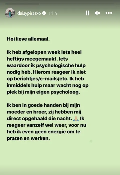 Op Instagram schrijft een verdrietige Daisy: "Ik heb de afgelopen week iets heel heftigs meegemaakt. Iets waardoor ik psychologische hulp nodig heb. Hierom reageer ik niet op berichtjes. Ik heb inmiddels hulp maar wacht nog op plek bij mijn eigen psycholoog.''