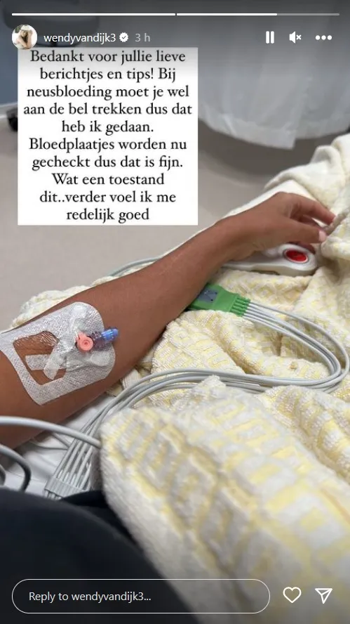 Gisteren werd bekend dat Wendy van Dijk op vakantie te grazen is genomen door een mug. Daardoor heeft ze knokkelkoorts opgelopen. Hoewel ze zich goed zegt te voelen kreeg ze last van een neusbloeding. Ze is meteen naar het ziekenhuis gegaan.