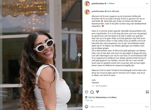 Telegraaf-verslaggever Jordi Versteegden wist te melden dat Yolanthe na de scheiding van Wesley een bedrag van