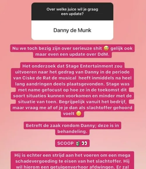 Na een paar dagen ging de storm alweer liggen en iedereen lijkt de zaak intussen te zijn vergeten. Behalve Yvonne Coldeweijer. Die deelt vandaag een 'update' via Instagram. Ze zegt: Het onderzoek dat Stage Entertainment zou uitvoeren naar het gedrag van Danny in de periode van Ciske de Rat de musical heeft inmiddels na heel lang aandringen deels plaatsgevonden. ''