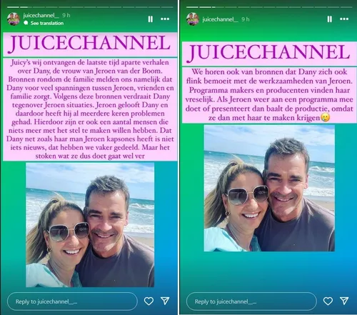 Er gaan hele vreemde verhalen rond over Dany, de vrouw van zanger Jeroen van der Boom. Die zou stoken binnen de familie en vrienden van Jeroen. Dat meldt het doorgaans goed ingevoerde kanaal Juicechannel op Instagram. 'Dany verdraait situaties'