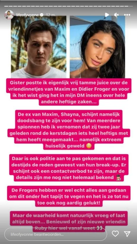 De ex-vriendin van Maxim, Shayna, zou 'doodsbang' zijn. ''Van meerdere spionnen heb ik vernomen dat zij twee jaar geleden rond de kerstdagen iets heeft heftigs met hem heeft gemaakt. Namelijk extreem huiselijk geweld.''