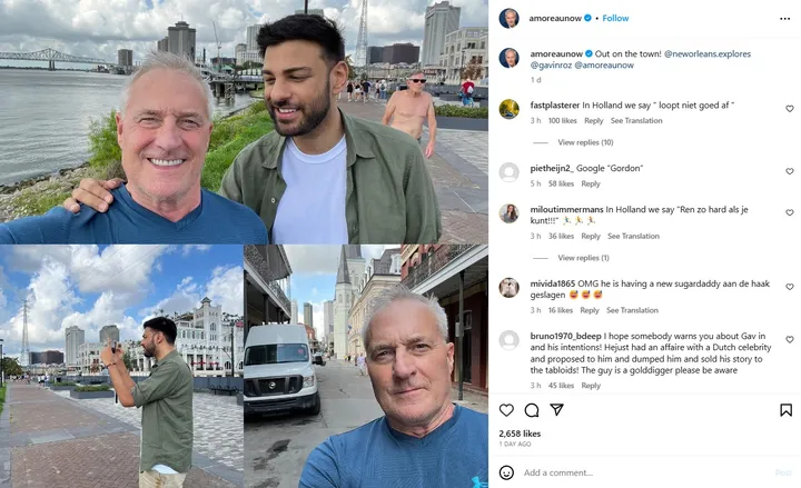 Gavin wel heel snel een nieuwe liefde aan de haak heeft geslagen. Onder de post zijn verschillende reacties te lezen, waarin mensen Michael waarschuwen. Ze raden hem aan de naam Gordon te Googelen, voor zijn eigen veiligheid. Hiermee insinueren ze dat Gavin een golddiger is die Goor gebruikte om hem kaal te plukken.