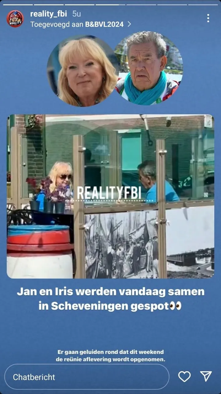 Aansluitend is de grote vraag natuurlijk waarom de twee daar zaten. Heeft het te maken met de reunie, die dit weekend misschien wordt opgnomen? ZIjn ze als vrienden een vorkje gaan prikken of vormen Jan en Iris een liefdeskoppeltje?