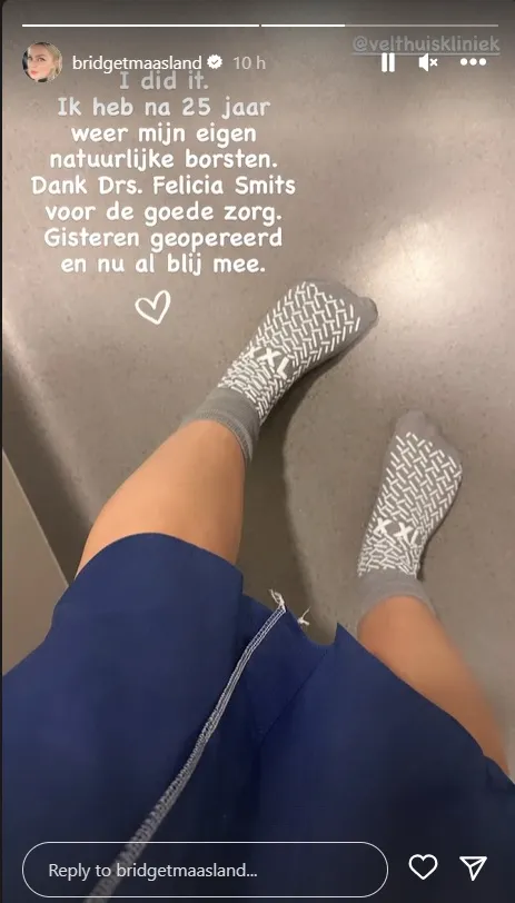 In het bericht deelt ze een foto van haar voeten, terwijl het dus eigenlijk over haar borsten gaat. Bij het plaatje schrijft ze: ''Ik heb het gedaan. Ik heb na 25 jaar weer mijn eigen natuurlijke borsten. Dank drs. Felicia Smits voor de goede zorg. Gisteren geopereerd, nu al blij mee!''