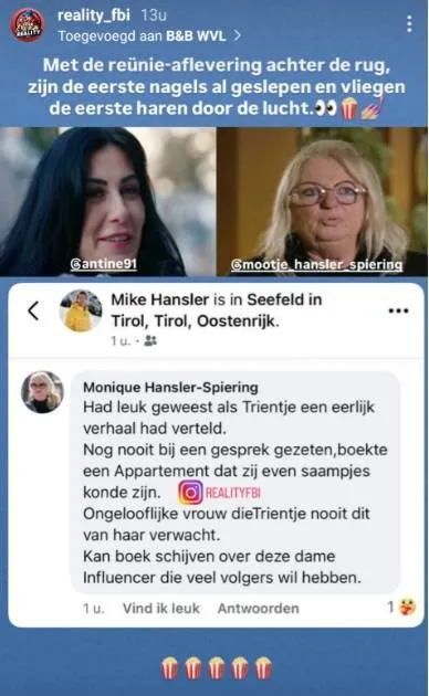 Monique, die Antine kleineert door haar 'Trientje' te noemen, weerspreekt ook de uitlatingen die Antine bij de reunie deed. ''Nog nooit bij een gesprek gezeten. Ongelooflijke vrouw die Trientje nooit dit van haar veracht. Kan boek schrijven over deze dame.''