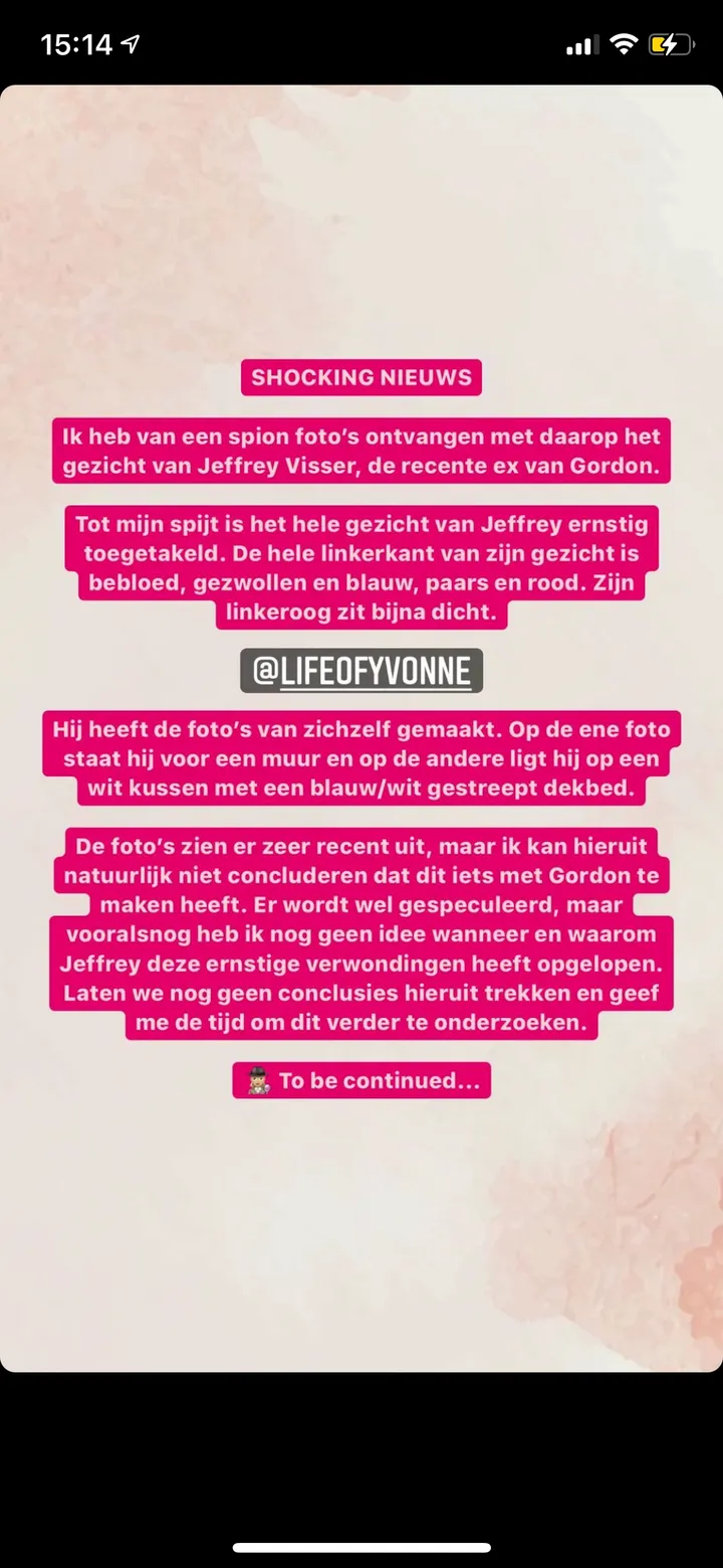 "Zoals je hebt gezien heb ik zojuist gepost dat ik foto’s heb ontvangen van Jeffrey (ex van Gordon) waarop hij ernstig is toegetakeld. Ik heb Gordon gesproken en hij ontkent in alle toonaarden dat hij hier iets mee te maken heeft en hij is heel erg erdoor geraakt dat Jeffrey is verwond."
